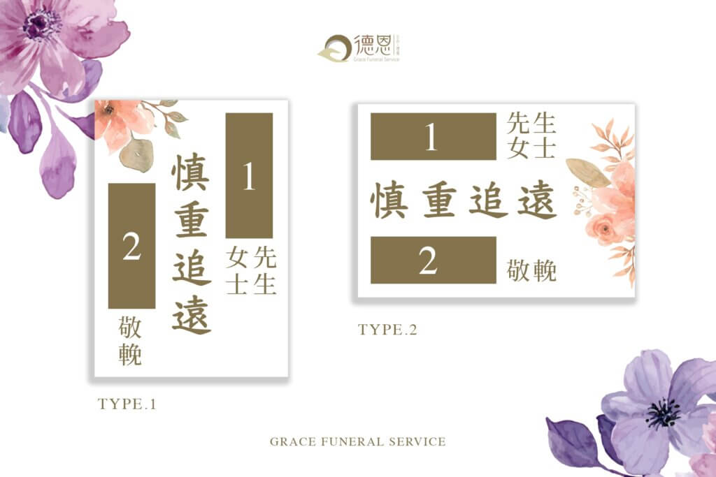 - 寫法一 上款 : 在編號1的位置上書寫逝者的名稱,女姓則是「靈右」、「蓮前」或「仙逝」、男性要使用「千古」或「靈前」。
