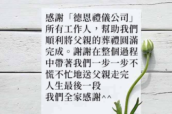 感謝「德恩禮儀公司」的所有工作人,幫助我們順利將父親的葬禮圓滿完成。親愛的阿偉謝謝你在整個過程中帶著我們一步一步不慌不忙地送父親走完人生最後一段,我們全家感謝你^^ 並推薦新竹的這間禮儀公司。
